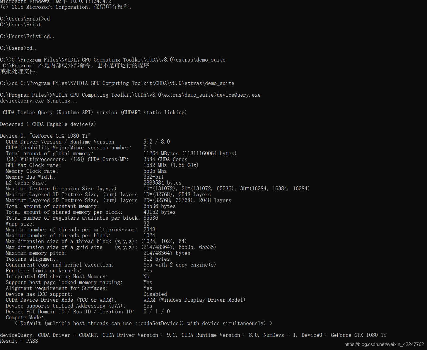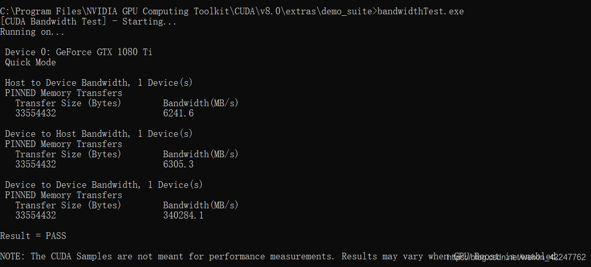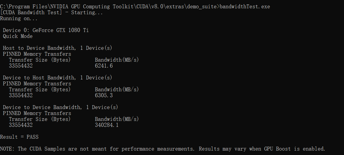 分别输入deviceQuery.exe 和 bandwidthTest.exe,运行结果如图所示。Rsult=PASS则说明通过