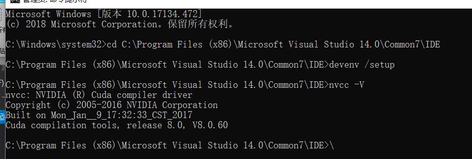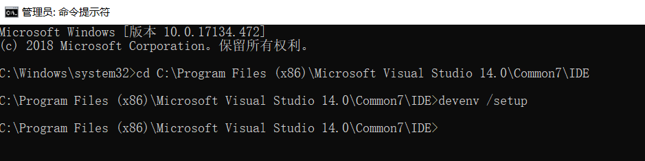 在路径 c:\ProgramFiles (x86)\Microsoft Visual Studio 14.0\Common7\IDE下,打开cmd(管理员身份): “devenv /setup”