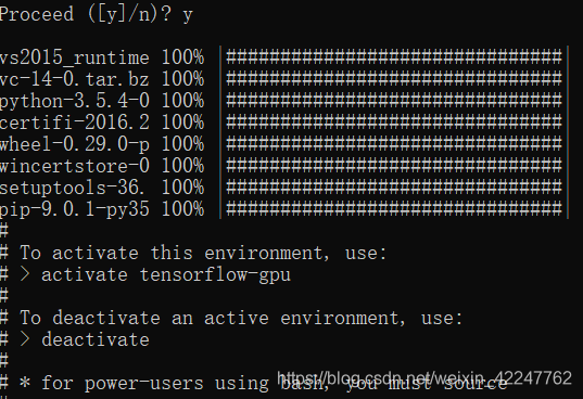 新建一个名字叫“tensorflow-gpu”,python版本为3.5的运行环境,此环境与Anaconda中其它环境隔离。红框中的软件包也会随之安装,输入“y“和回车后开始安装。