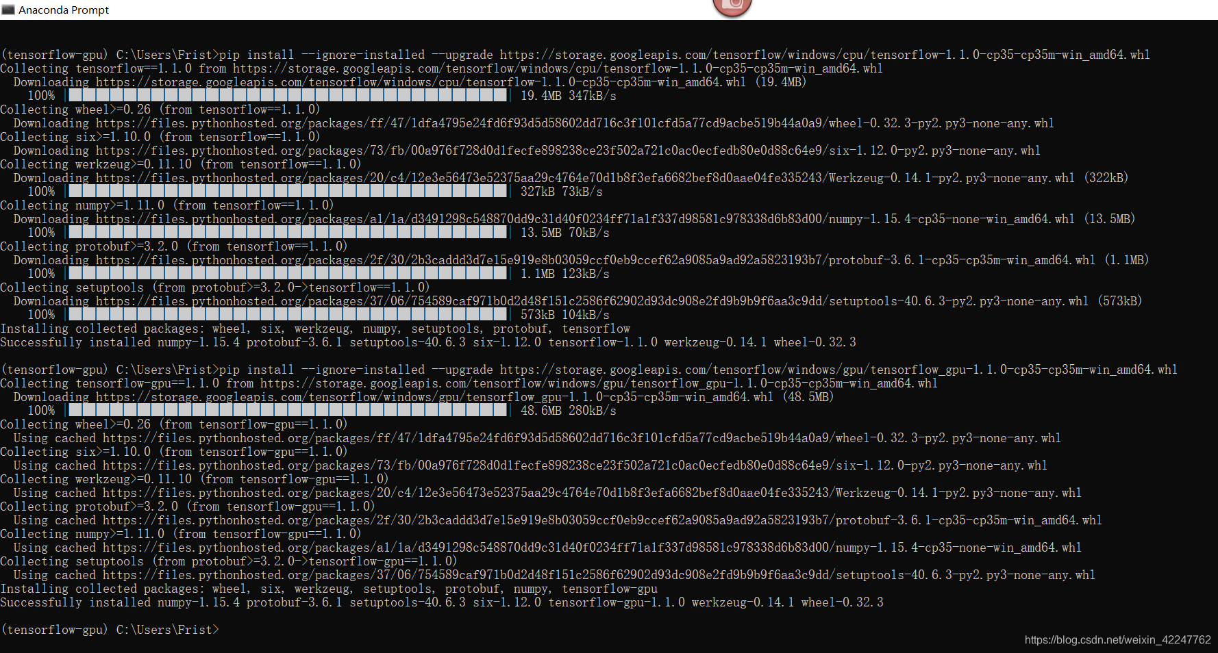 - 在tensorflow环境下,使用pip安装GPU版TensorFlow,执行命令