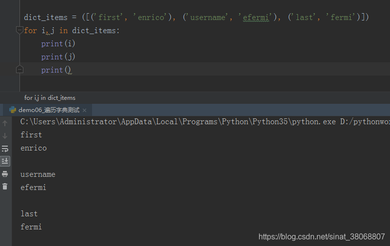 dict_items = ([('first', 'enrico'), ('username', 'efermi'), ('last', 'fermi')]) for i,j in dict_items: print(i) print(j) print()