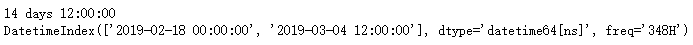 # 偏移量通过加法连接 sum_offset = pd.tseries.offsets.Week(2) + pd.tseries.offsets.Hour(12) print(sum_offset) print(pd.date_range('2019/02/18', '2019/03/18', freq=sum_offset))运行: