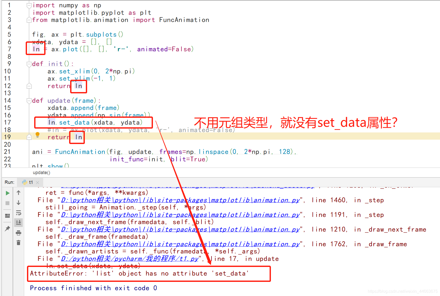 直接把逗号取消确实会出现问题。因为用了元组,返回的是matplotlib类,但是单个变量返回的是list类,自然就没有set_data属性了。