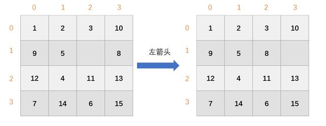假如移动之前个数字位置如左图所示,那么当按下左箭头时,会变成如右图所示: