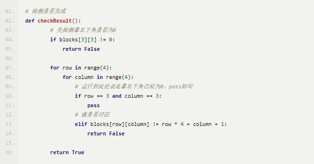 检测是否胜利其实很简单:前15个位置分别对应,最后一个为0即为胜利 ,不过为了避免不必要的计算,我们先检测最后一个是否为 0 ,如果不为0 前面的就不用比较了。具体代码实现如下: