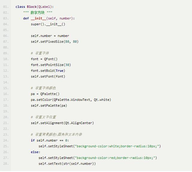 该类继承自 QLablel ,初始化需要传入一个参数 number ,number就是数字方块上显示的数字。