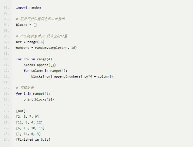 如上图所示,本游戏共需要15个方块,每个方块代表一个数字。我们可以使用 一个二维 list来存储方块上的数字。其实我们要创建一个 4x4 的 list 存储 0~15 各个数字,0 代表空的位置。