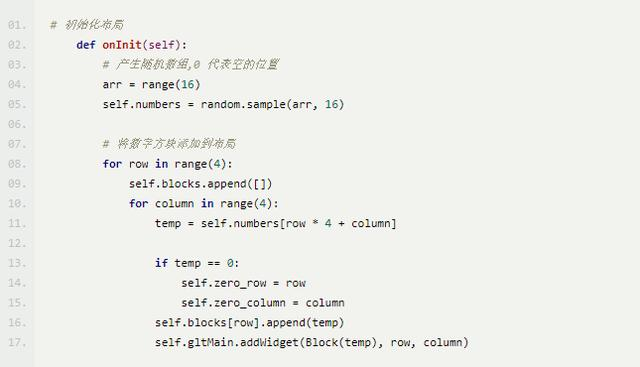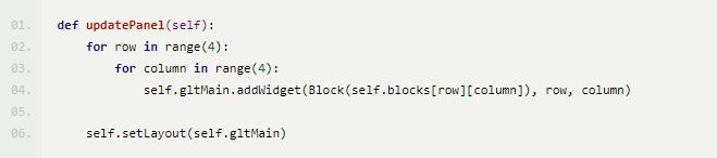 布局采用 QGridLayout 创建一个 4X4 的 self.gltMain,将16个 Block 添加到 self.gltMain: