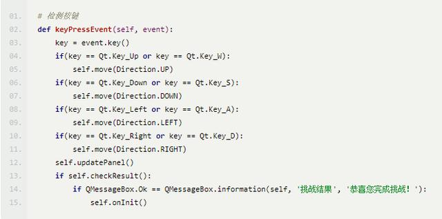 按键检测到按键按下之后判断该键值是否为 “↑↓←→”或“WSAD”,并作出相应的移动(move),移动之后刷新布局(updatePannel),最后检测是否完成挑战(checkResult),如果完成挑战,弹出提示框。如果点击了 OK 按钮,游戏重新开始(onInit)。