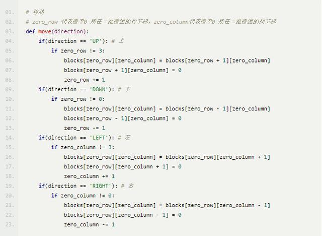 总结一下:如果 数字 0 所在位置为 (row, column),并且 column≠3 那么按下左箭头之后,(row, column) 和 (row, column+1) 位置上的数组互换,同理可得: