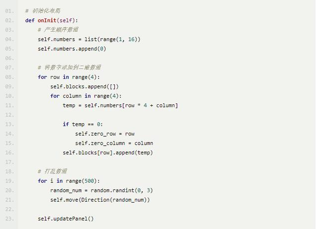先生成一个顺序数组,里面保存着**[1, 2, 3, 4, 5, 6, 7, 8, 9, 10, 11, 12, 13, 14, 15, 0]**,然后转为二维数组 blocks,再后随即移动500次,最后添加到布局。