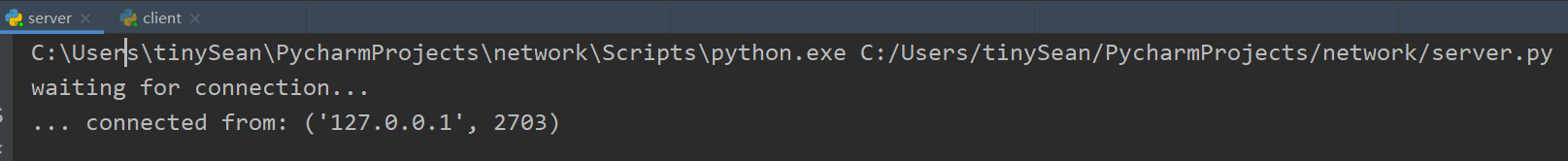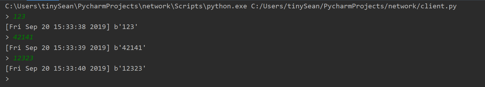 from socket import * HOST = '127.0.0.1' PORT = 21567 ## 端口号 BUFSIZE = 1024 ## 每次传送1MB ADDR = (HOST, PORT) tcpCliSock = socket(AF_INET, SOCK_STREAM) ## 创建SOCKET tcpCliSock.connect(ADDR) ## 连接客户端 while True: data = input('> ') ## 待发送信息 if not data: break tcpCliSock.send(bytes(data, encoding='utf-8')) ## 发送信息 data = tcpCliSock.recv(BUFSIZE) ## 接受信息 if not data: break print(data.decode('utf-8')) ## 用utf-8解码接受到的字节流 tcpCliSock.close() ## 关闭socket 1.3 运行结果