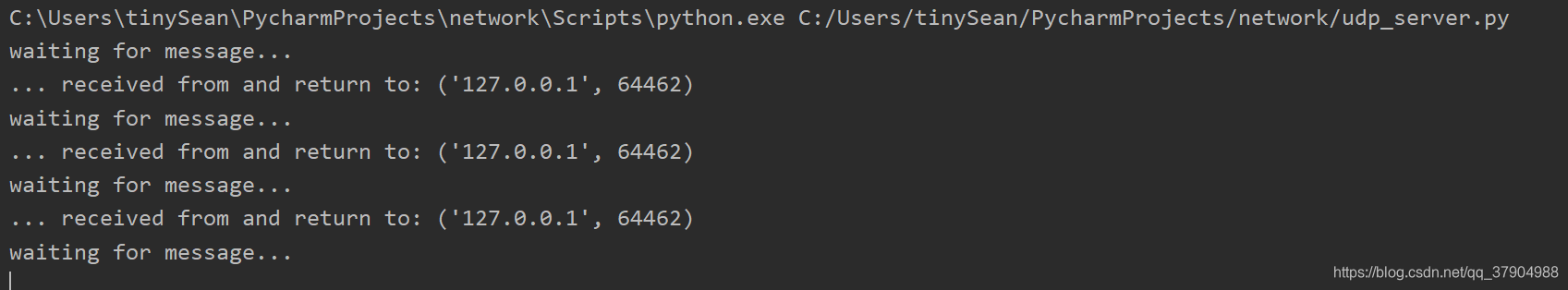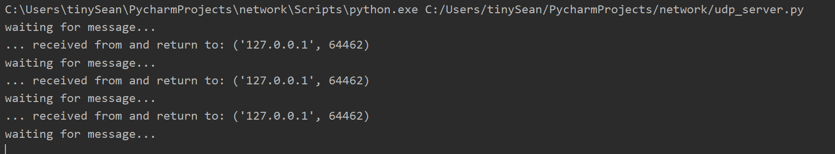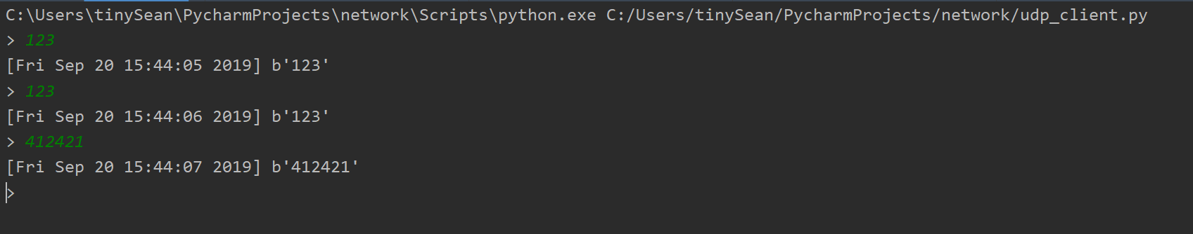 from socket import * HOST = '127.0.0.1' PORT = 21567 ## 端口号 BUFSIZE = 1024 ## 每次传送1MB ADDR = (HOST, PORT) udpCliSock = socket(AF_INET, SOCK_DGRAM) ## 创建SOCKET ## 无需连接服务器端 while True: data = input('> ') ## 待发送信息 if not data: break udpCliSock.sendto(bytes(data, encoding='utf-8'), ADDR) ## 发送信息 data, ADDR = udpCliSock.recvfrom(BUFSIZE) ## 接受信息 if not data: break print(data.decode('utf-8')) ## 用utf-8解码接受到的字节流 udpCliSock.close() ## 关闭socket 2.3 运行截图