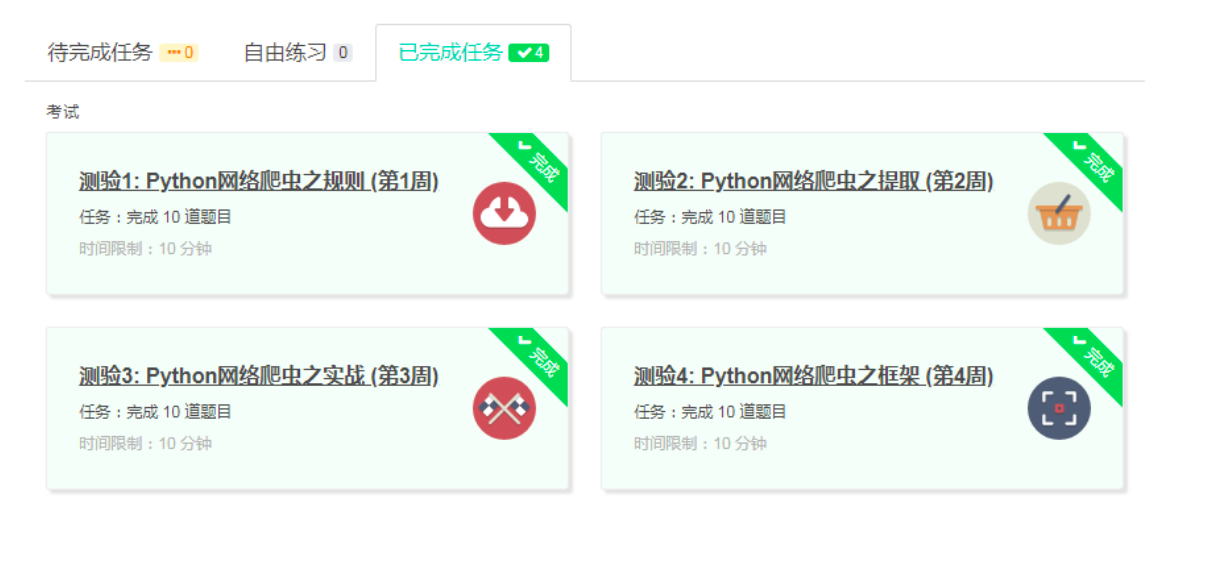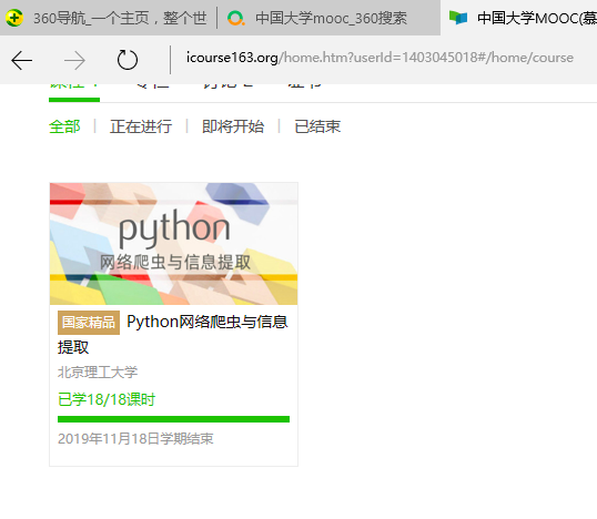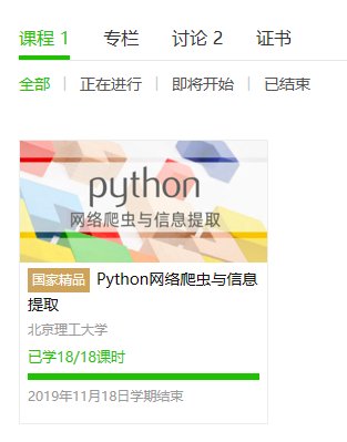 1.注册中国大学MOOC 2.选择北京理工大学嵩天老师的《Python网络爬虫与信息提取》MOOC课程 3.学习完成第0周至第4周的课程内容,并完成各周作业 4.提供图片或网站显示的学习进度,证明学习的过程。 5.写一篇不少于1000字的学习笔记,谈一下学习的体会和收获 来源:博客园作者:huang可爱链接:https://www.cnblogs.com/huangqin1094187447/p/11768634.html 标签 大学