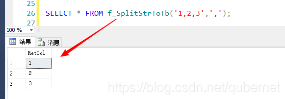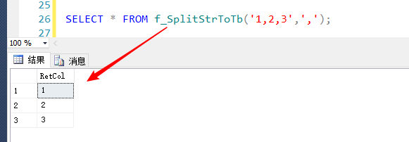 /****************************** 将字符串按照某字符(逗号)分隔查询返回为一个临时表 ******************************/ CREATE FUNCTION f_SplitStrToTb ( @totaltr NVARCHAR(MAX),--需要拆分的字符串(如:1,2,3,4) @totalplit VARCHAR(10) --拆分的符号 ) RETURNS @Table TABLE ( RetCol VARCHAR(100) ) AS BEGIN DECLARE @index INT DECLARE @total INT SET @index = 1 SET @total = 1 WHILE (@index > 0) BEGIN SET @index = CHARINDEX(@totalplit, @totaltr, @total) IF (@index > 0) BEGIN INSERT @Table ( RetCol ) VALUES (SUBSTRING(@totaltr, @total, @index - @total)) END ELSE BEGIN INSERT @Table ( RetCol ) VALUES (SUBSTRING(@totaltr, @total, LEN(@totaltr) - @total + 1)) END SET @total = @index + 1 END RETURN END 查询效果如下所示: