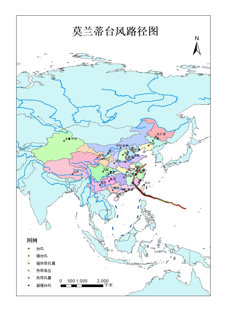 5、分析莫拉蒂台风影响我国大陆的城市,并制作莫拉蒂台风影响城市分布图,并用不同符号表示影响程度。