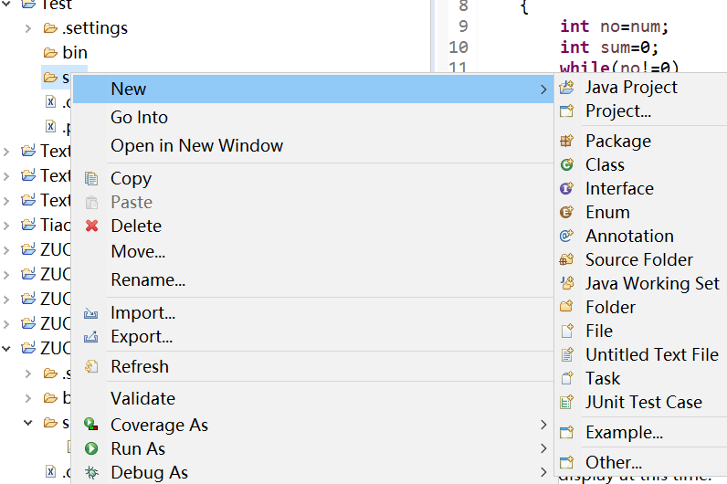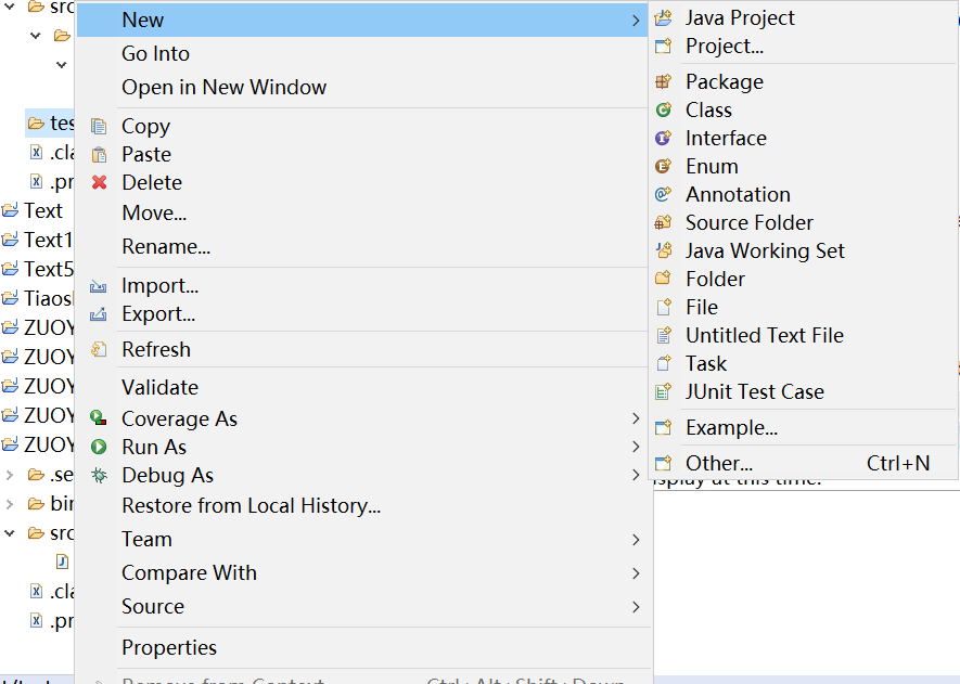 在test上右击――New――Class然后建立相应的包,至于测试的类名可以改成Test+原来类的名字