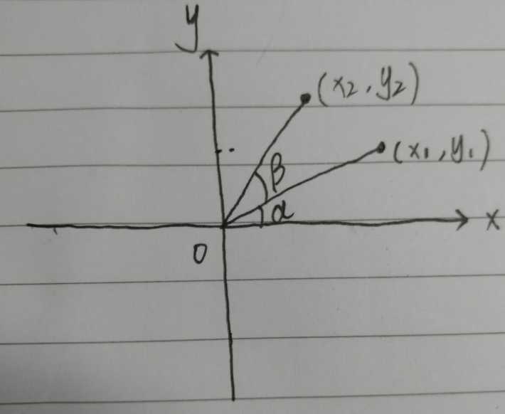 在该图中,我们假设点(x1, y1)经过旋转β角度之后到达(x2, y2)的位置,下边我们需要推倒出这两个点之间有什么关系。