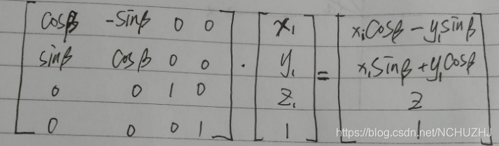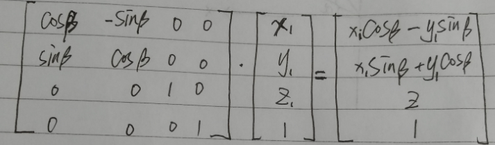 仔细看看上边的(x1, y1, z1)向量经过矩阵的线性变换之后是和上边推到出来的关系一样的,所有我们可以得到绕着Z轴旋转