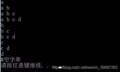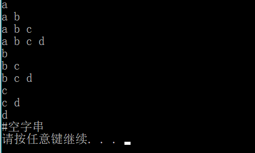 void Funstr(char *str,int m,int n) { if(m==n) { cout<<str[m]<<endl; return ; } for(int j =m;j<=n;j++) { for(int i=m;i<=j;i++) cout<<str[i]<<" "; cout<<endl; } Funstr(str,m+1,n); } int main() { char str[] = "abcd"; Funstr(str,0,3); system("pause"); return 0; }