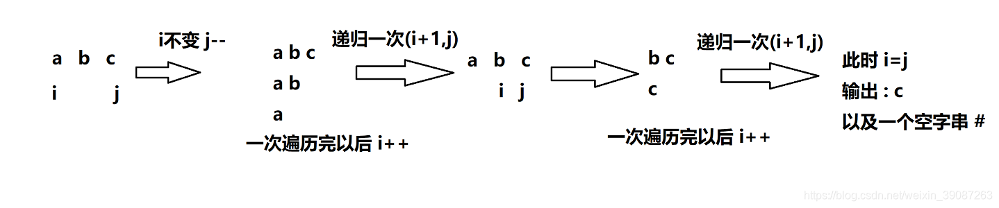 (1)i指向初始位置,j指向末位位置,遍历一次abc,输出,将i指针移动,一次输出,
