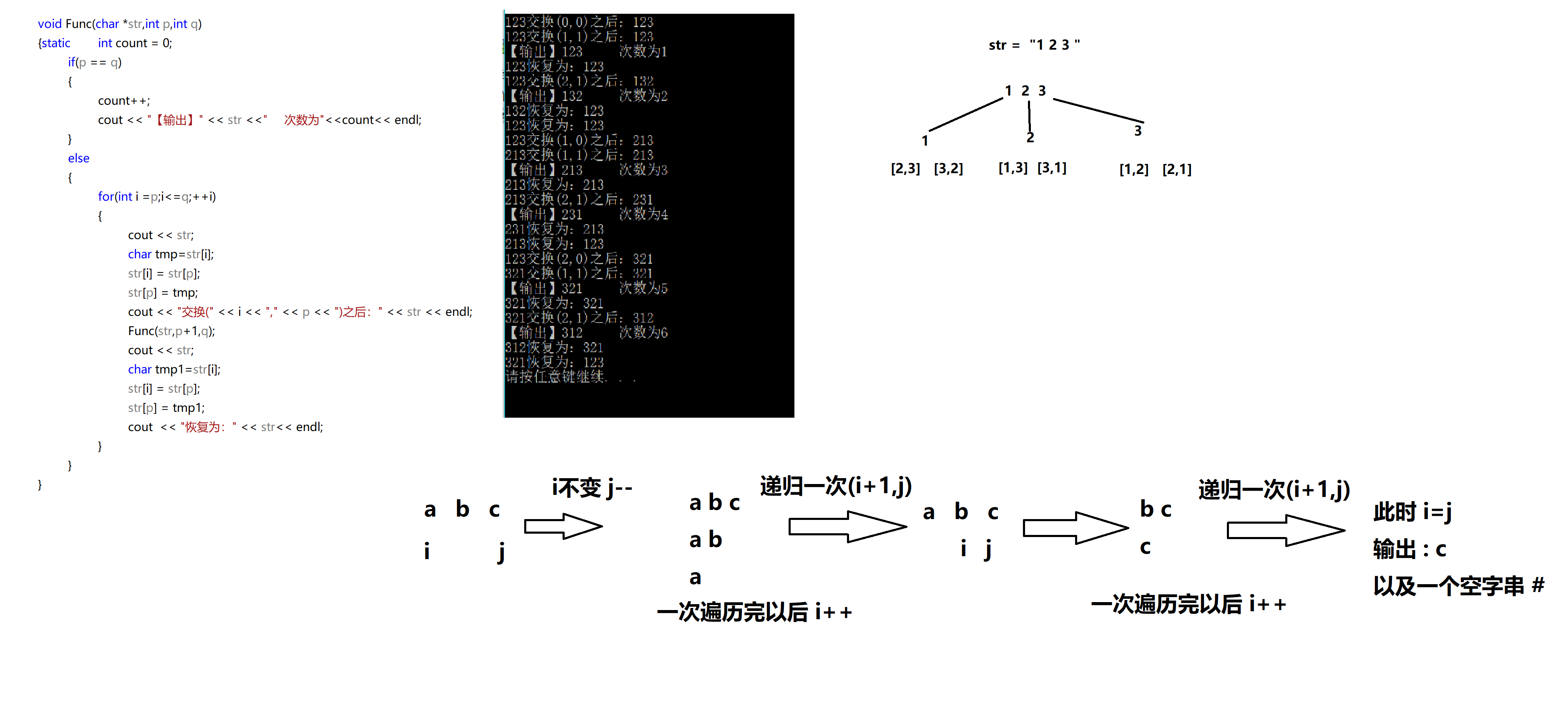 void Fun(char *str,int p, int q) { static int count = 0; if(p == q) { count++; cout << "【输出】" << str <<" 次数为"<<count<< endl; } else { for(int i =p;i<=q;++i) { cout << str; char tmp=str[i]; str[i] = str[p]; str[p] = tmp; cout << "交换(" << i << "," << p << ")之后:" << str << endl; Fun(str,p+1,q); cout << str; char tmp1=str[i]; str[i] = str[p]; str[p] = tmp1; cout << "恢复为:" << str<<"恢复了"<< endl; } } } int main() { char *str[] ="abc"; Fun(str,0,2); return 0; }
