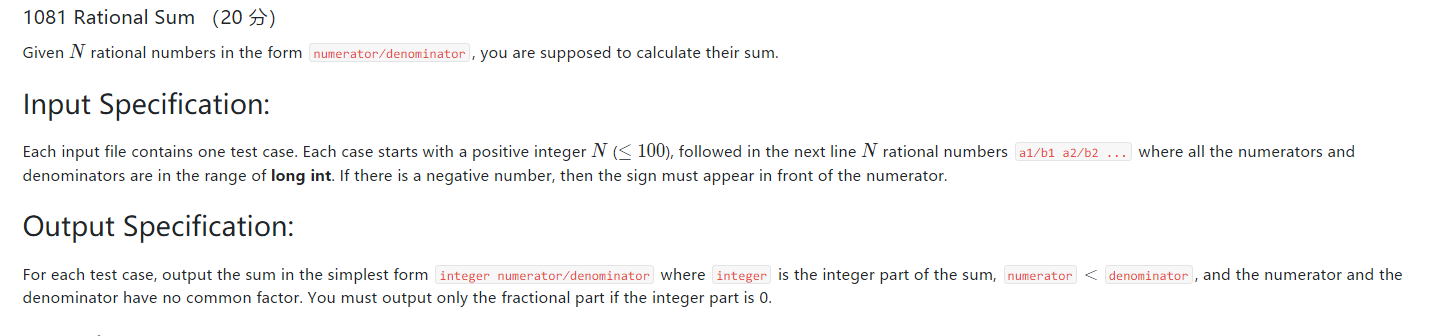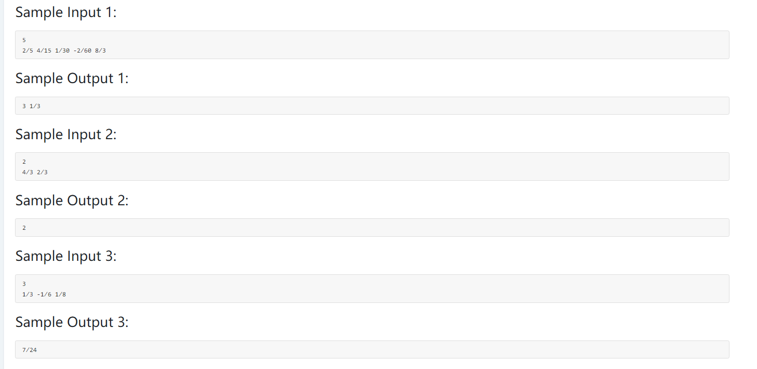 #include<iostream> #include<cstdio> #include<fstream> #include<set> #include<cmath> #include<cstring> #include<string> #include<map> #include<vector> #include<iomanip> #include<cstdlib> #include<list> #include<queue> #include<stack> #include<algorithm> #define inf 0x3f3f3f3f #define MOD 1000000007 #define mem0(a) memset(a,0,sizeof(a)) #define mem1(a) memset(a,-1,sizeof(a)) #define meminf(a) memset(a,inf,sizeof(a)) //vector ::iterator it; //set<int>::iterator iter; typedef long long ll; typedef unsigned long long ull; using namespace std; ll fun(ll a,ll b) { //cout<<a<<' '<<b<<'*'; while(b) { ll t=b; b=a%b; a=t; } // cout<<a<<endl; return a; } int main() { ll numerator[110]={0},denominator[110]={0},n; for(int i=0;i<110;i++)denominator[i]=1; cin>>n; for(int i=0;i<n;i++) { scanf("%lld/%lld",&numerator[i],&denominator[i]); } // sort(denominator,denominator+n); ll bei=denominator[1]*denominator[0]/fun(max(denominator[1],denominator[0]),min(denominator[1],denominator[0]));//先得到前两个分母的最小公倍数 //cout<<bei<<endl; for(int i=2;i<n;i++) { bei=denominator[i]*bei/fun(max(denominator[i],bei),min(denominator[i],bei));//依次 // cout<<bei<<endl;递推得到所有分母的最小公倍数 } ll sum=0; for(int i=0;i<n;i++) { ll k=bei/denominator[i];//通分 sum+=k*numerator[i];//计算分子和 //cout<<sum<<'*'<<k*numerator[i]<<endl; } //cout<<sum<<' '<<bei<<endl; ll inter=sum/bei,mmo=fabs(sum%bei);//取整数和余数部分 bool flag=false;//对于整数和分数部分存在0情况的标记 if(inter) { cout<<inter; flag=true; } ll p=fun(max(mmo,bei),min(mmo,bei)); //p=fabs(p); mmo=mmo/p;bei=bei/p; if(mmo) { if(inter)cout<<' '; cout<<mmo<<'/'<<bei; flag=true; } if(!flag)cout<<0; cout<<endl; // std::ios::sync_with_stdio(false); // cin.tie(0); // freopen("test.txt","r",stdin); // freopen("output.txt","w",stdout); return 0; } 文章来源: 1081 Rational Sum