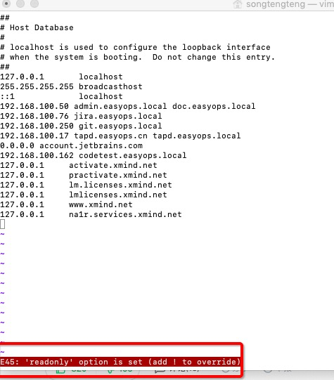 问题描述: E45: 'readonly' option is set (add ! to override) 原因分析:当前用户没有权限进行这种操作。 我在终端的操作是这样的:vim /etc/hosts,然后退出,进行提权操作,使用root权限即可。 文章来源: E45: 'readonly' option is set (add ! to override)的解决方案 标签 option