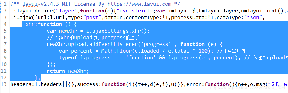 xhr:function () { var newXhr = i.ajaxSettings.xhr(); // 给xhr的upload添加progress的监听 newXhr.upload.addEventListener('progress' , function (e) { var percent = Math.floor(e.loaded / e.total * 100); //计算出进度 typeof l.progress === 'function' && l.progress(e , percent); // 传递给upload的progress回调 }); return newXhr; },
