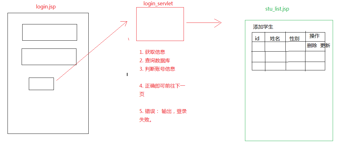 protected void doGet(HttpServletRequest request, HttpServletResponse response) throws ServletException, IOException { //提交的数据有可能有中文, 怎么处理。 request.setCharacterEncoding("UTF-8"); response.setContentType("text/html;charset=utf-8"); //1. 获取客户端提交的信息 String userName = request.getParameter("username"); String password = request.getParameter("password"); //2. 去访问dao , 看看是否满足登录。 UserDao dao = new UserDaoImpl(); boolean isSuccess = dao.login(userName, password); //3. 针对dao的返回结果,做出响应 if(isSuccess){ //response.getWriter().write("登录成功."); //1. 查询出来所有的学生信息。 StuDao stuDao = new StuDaoImpl(); List<Student> list = stuDao.findAll(); //2. 先把这个集合存到作用域中。 request.getSession().setAttribute("list", list); //2. 重定向 response.sendRedirect("stu_list.jsp"); }else{ response.getWriter().write("用户名或者密码错误!"); }}