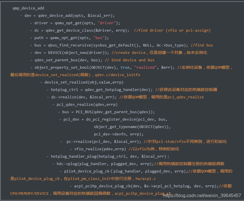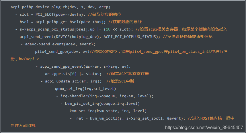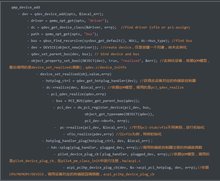 上述过程通过分析参数,找到bus、device,并分别完成类别初始化和对象实例化。最后找到对应的热插拔回调函数acpi_pcihp_device_plug_cb,执行ACPI-based 热插拔。