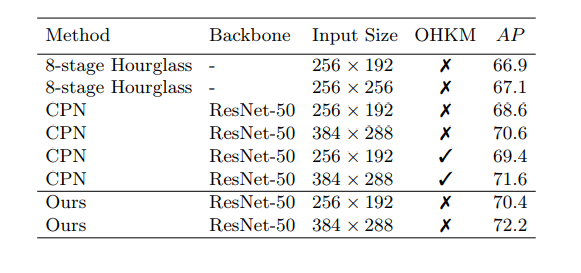 文中解释为“ the performance difference could come from implementation difference”,也就是本文可能在调参、数据增强等方面可能做得很好,才有这样的结果。比如文中提到使用原图和翻转过的图片同时测试,以及最终结果会由Heatmap的最大值点向第二大值点进行一些偏移等技巧(看起来有点像做比赛^ ^),其他我就不一一翻译了,感兴趣的可以直接查看原文。