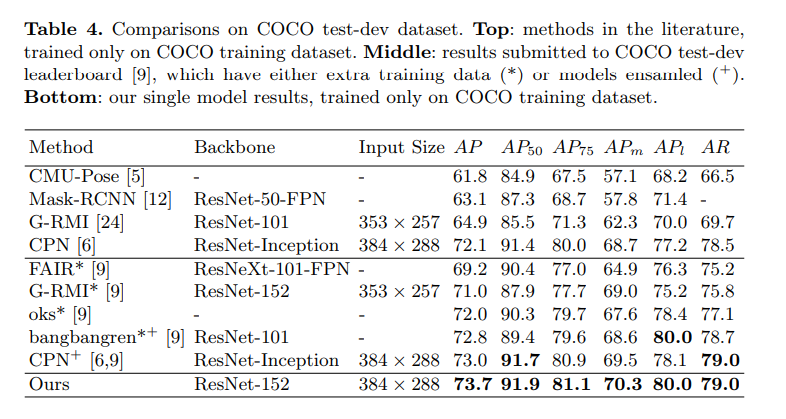 但是本文的方法在COCO关键点检测的任务上比CPN,Hourglass得到了更高的AP,如图: