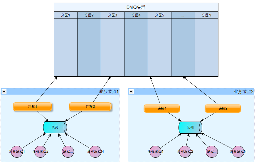 对第一步,业务作为dmq客户端,启动N个连接去连接dmq,连接数由配置项mq.consumer.connections指定,一般模块都没配置(目前小组内框架设置的默认值是2)