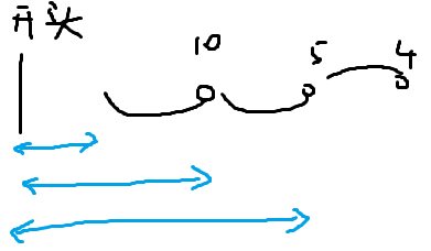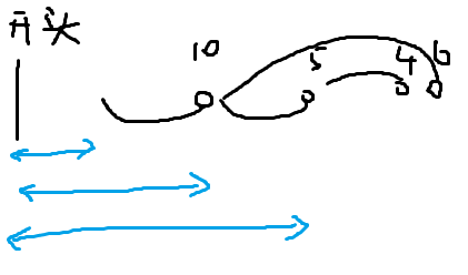有这三个位置,他们一定是单调递减的,因为如果有递增的话,前面那个小的d会被后面大的d取代掉,所以就变成这样。sta记录的就是10的位置和蓝色的线,5的位置和蓝色的线。