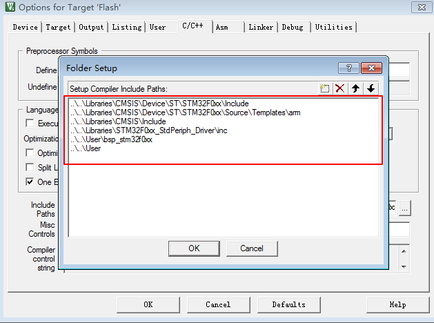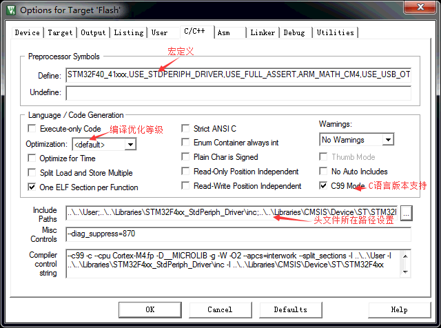 - “C/C++”页面中,设置了工程中使用的宏定义、编译器优化等级、C语言版本支持、工程中所使用的头文件路径。