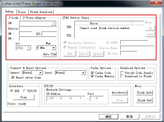 - 当接入J-Link调试器后,打开的界面中会有J-Link设备相关信息。“Debug”页面默认配置即可,点击“Flash Download”选项卡,配置Flash相关参数。