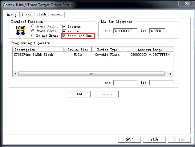 - “Flash Download”页面可以勾选“Reset and Run”表示下载后立即复位并运行。同时下方已经默认包含Flash信息,如果没有默认信息,需要手动点击“Add”按钮进行添加。