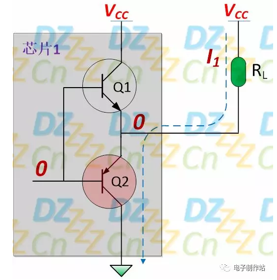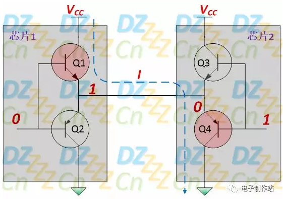 假设如上图所示芯片的输出分别为0与1,则两者直接相互连接后,会有非常大的电流自电源VCC经Q1与Q4到公共地,虽然大多数情况下不至于烧芯片,但也会引起很大的功率消耗,同时也会导致数据冲突(芯片1总会试图将数据线拉高,而芯片2则会试图将数据线拉低,我们称之为数据冲突或总线冲突,表示双方都在抢占总线)