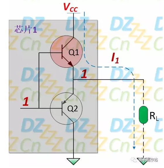 制信号为高电平“H”时,Q1导通Q2截止,电流I1由电源VCC经三极管Q1与负载RL流向公共地,我们称此电流为拉电流(Source Current),也就是芯片内部可以向外提供的电流(所以称之为“源电源”),从另一个角度讲,也就是外电路可以从芯片中拉走多少电流,如下图所示: