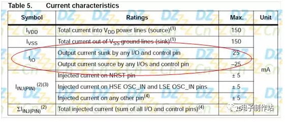 由上表可知,STM32的IO引脚的驱动能力为25mA,负号“-”表示电流的方向,灌与拉的电流方向是相反的(表中SUNK为SINK的过去分词)