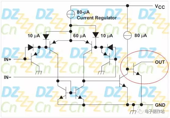 大多数比较器芯片的输出都是OD/OC输出结构,如下图所示(来自TI比较器LM393数据手册):