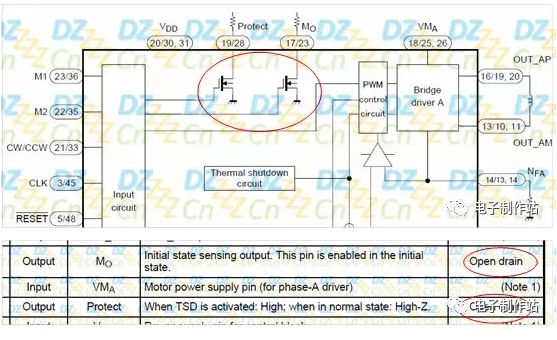 很多芯片或模块向外反馈系统状态的信号引脚也是这种结构,这样用户就可以根据电路系统实际需要将电平上拉到对应的电源电压VCC,就可以省略电平转换了,如下图所示(来自东芝步进电机控制芯片TB6560数据手册):