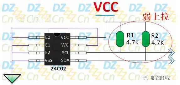 强拉电阻的极端就是零欧姆电阻,亦即将信号线直接与电源或地相连接,比如,对于EEPROM存储芯片24C02应用电路,如下图所示: