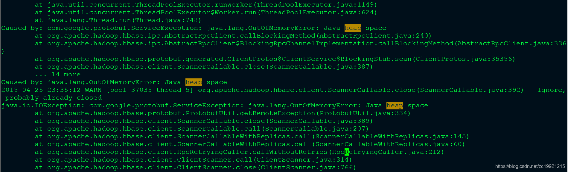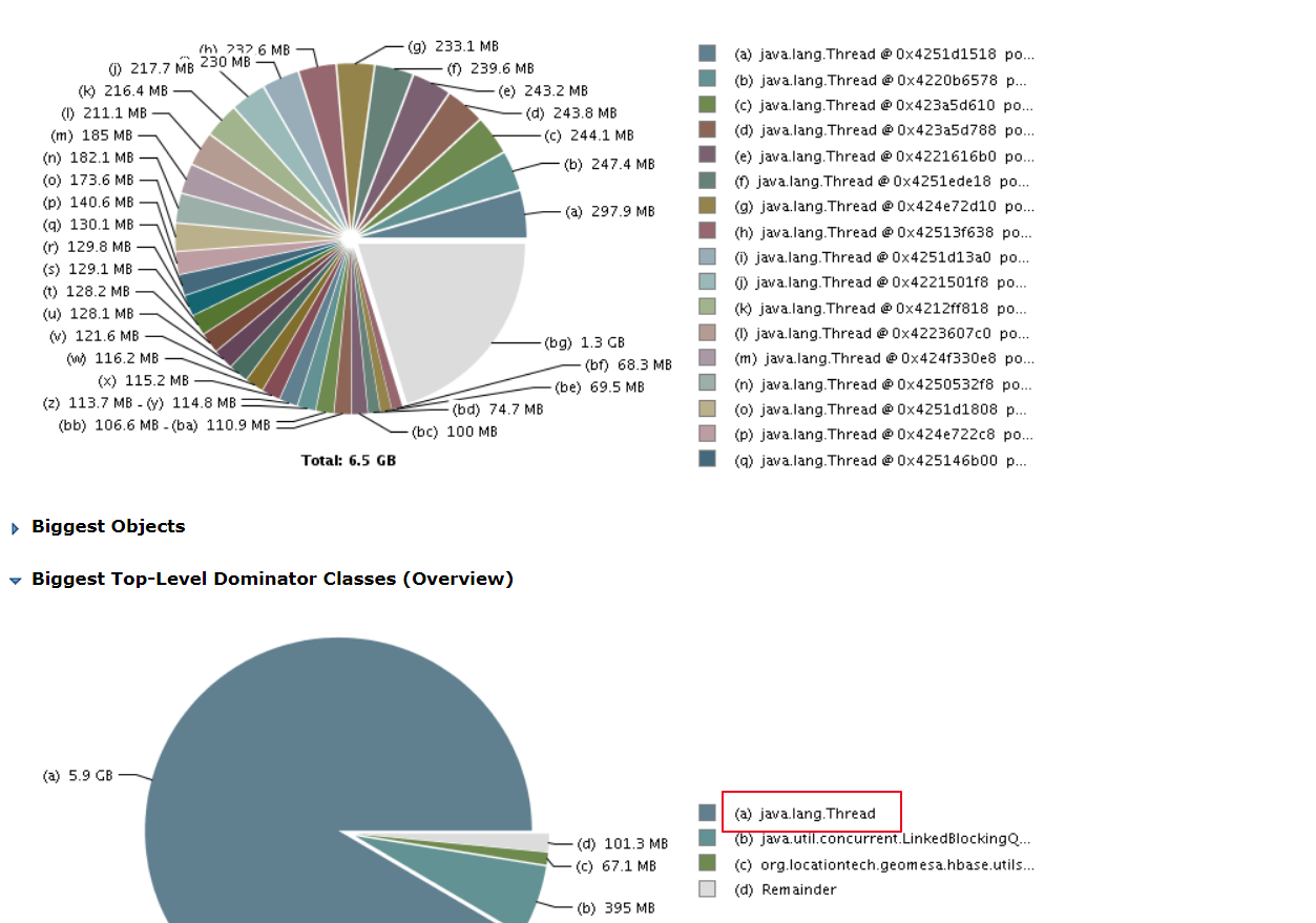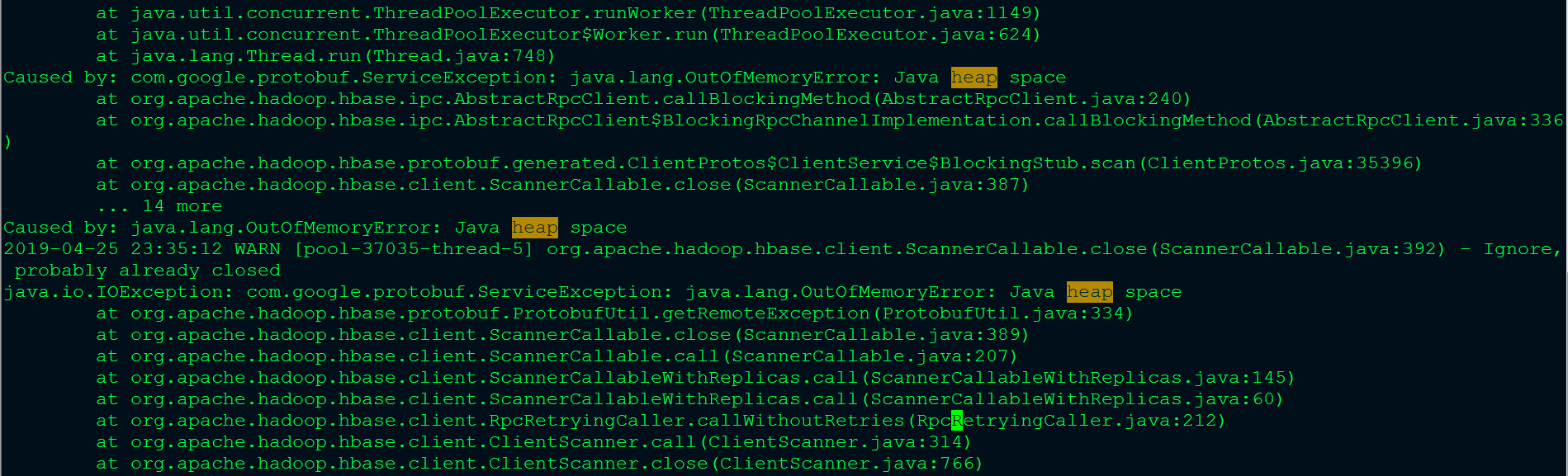 这里判断那里内存溢出,需要结合代码以及堆栈文件了。结合工程的逻辑,这里一看就知道是多线程的问题,线程太多并且每个线程要拉取的HBase数据太多造成JVM内存溢出。