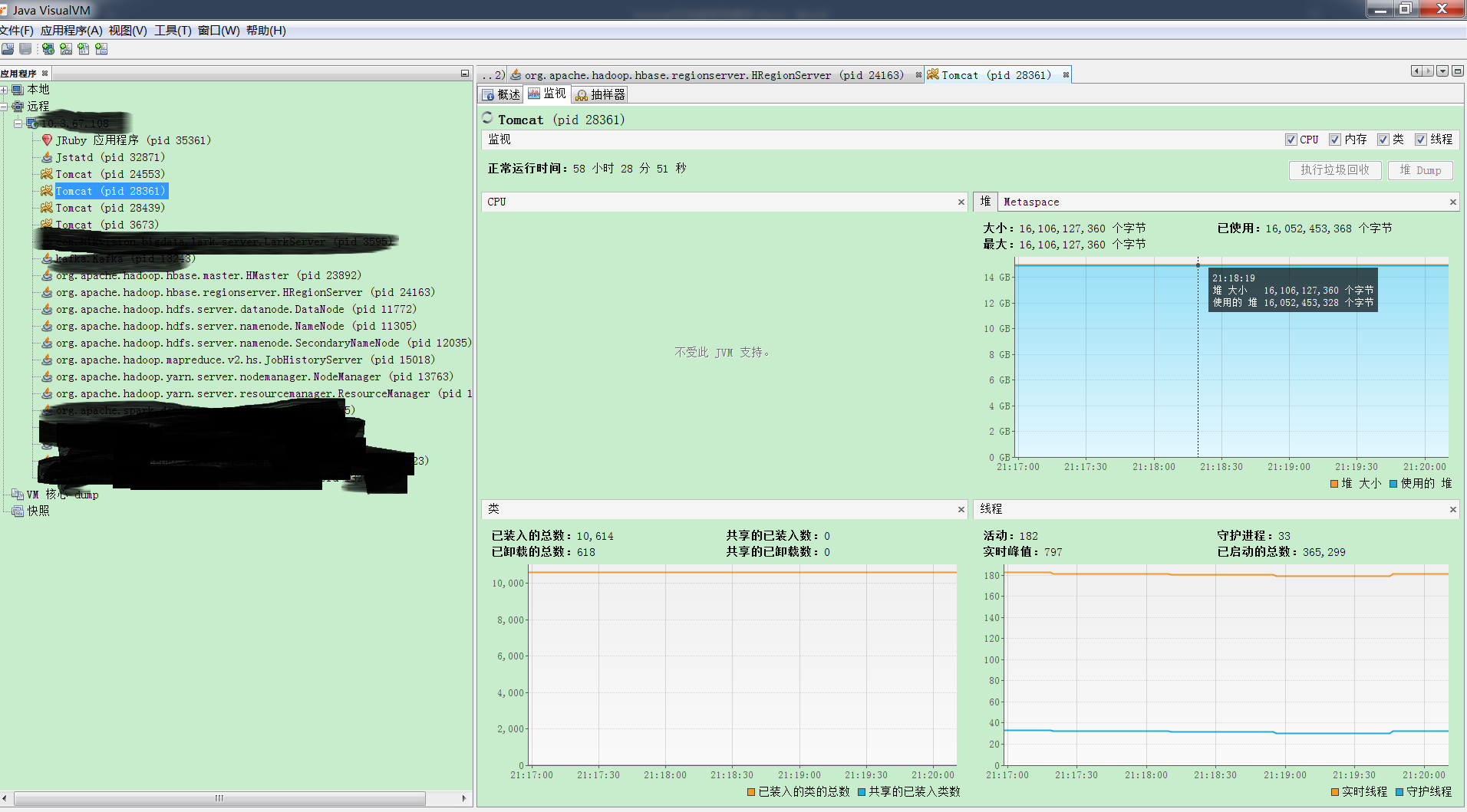 - 使用visualvm查看下tomcat进程的堆栈情况。(怎么使用visualvm看我之前写的那篇文章-“使用visualvm远程监控Java程序”),发现堆内存占用很大。一段时间后,日志里面也报了错误: