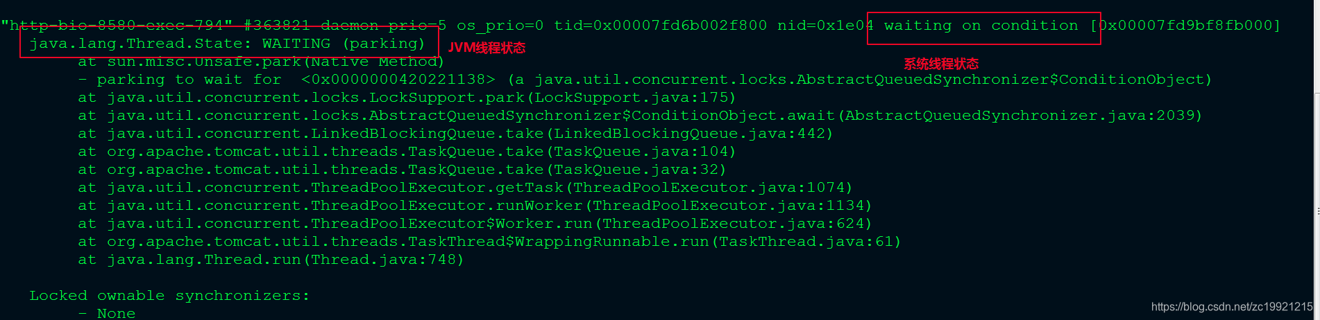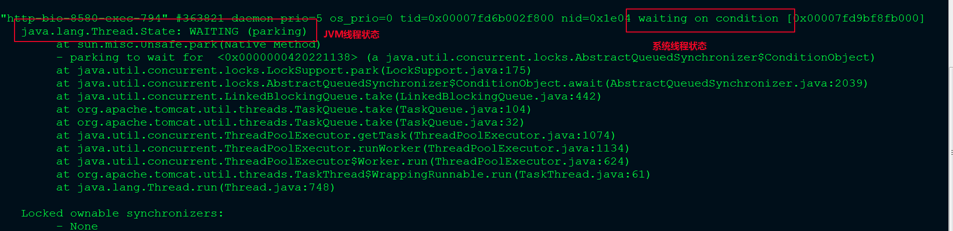 来看下JAVA EE这部分的内容,从堆栈文件中可以看到线程会显示两种状态,一种是操作系统线程状态,一种是JVM线程状态(在Thread.State枚举类中有说明):