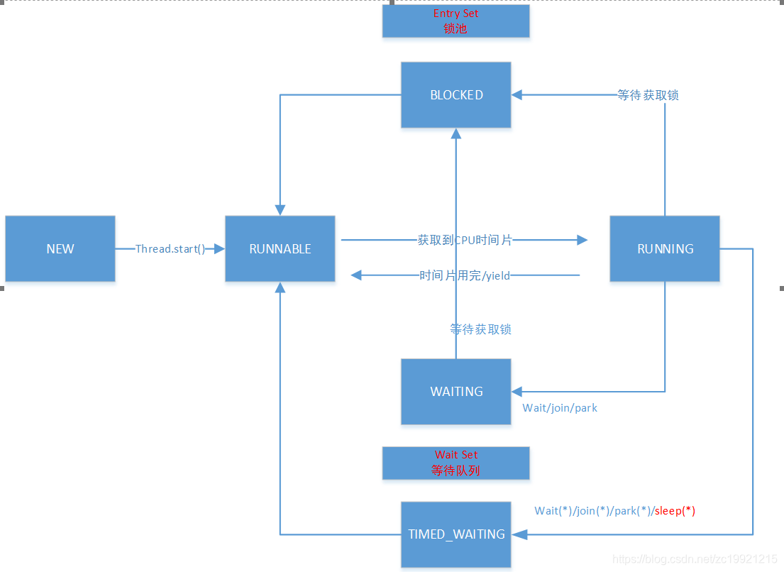 线程等待获取监视器锁(monitor lock)以期进入同步代码块/方法(即等待锁,并且是synchronized)中。(下面会说到Monitor中的Entry Set和Wait Set,BLOCKED还有下面即将说到的WAITING和TIMED_WAITING都和这两个队列有关)