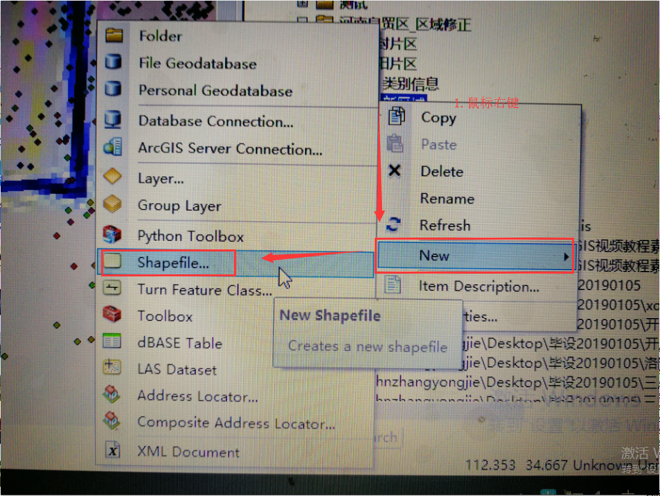 1.打开ArcMap软件 2.找到右侧的目录,在要创建.shp文件的文件路径上右键鼠标,或者点击Connect To Folder,找到想添加的目录,再进行相应操作 3.单击new,单击创建Shapefile文件 4.修改.shp文件的名称,确定.shp文件的要素的类别。 文章来源: https://blog.csdn.net/qq_41547659/article/details/89735509 标签 arcmap