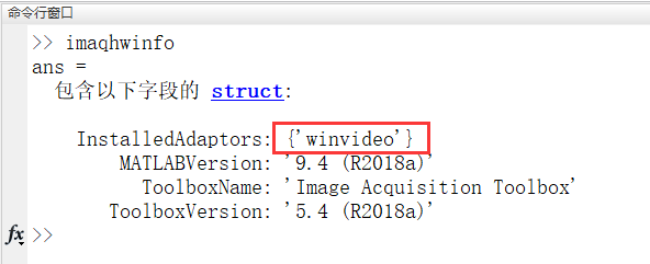 输入 imaqhwinfo,查看当前适配器